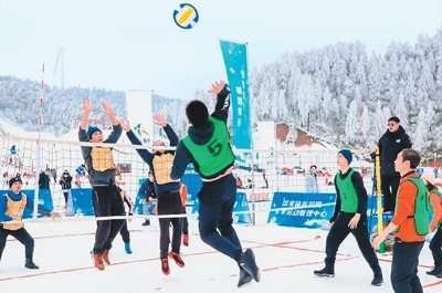 在重慶市豐都區(qū)南天湖冰雪旅游季川渝雪地氣排球邀請賽上,選手在激烈比拼。楊 森攝