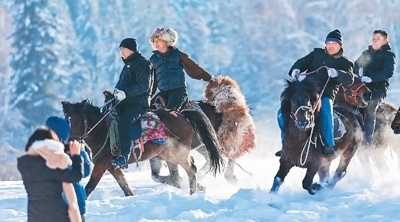 新疆維吾爾自治區(qū)阿勒泰地區(qū)富蘊縣可可托海鎮(zhèn)塔拉特村,村民為游客表演叼羊。新華社記者 丁 磊攝