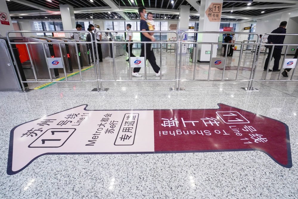 2023年6月24日,乘客在蘇州軌道交通11號(hào)線花橋站進(jìn)站乘車。當(dāng)日,蘇州軌道交通11號(hào)線正式投入運(yùn)營(yíng),并與上海軌道交通11號(hào)線實(shí)現(xiàn)無(wú)縫換乘,長(zhǎng)三角核心城市間首次實(shí)現(xiàn)地鐵系統(tǒng)跨省互聯(lián)互通。新華社記者 李博 攝