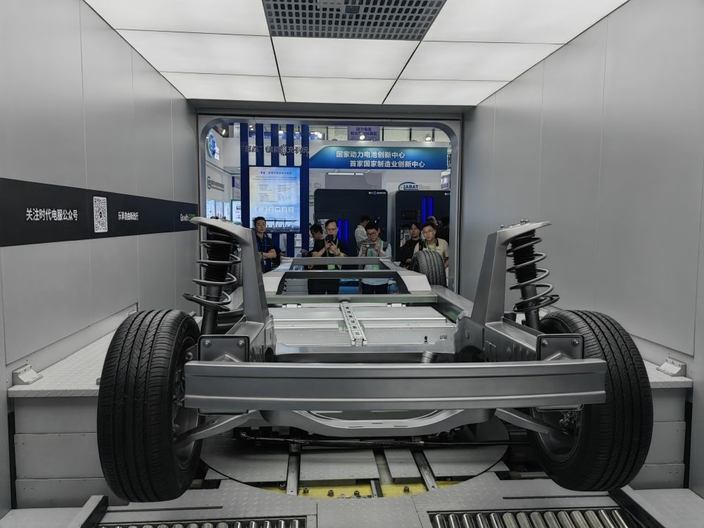 這是在四川省宜賓市舉行的2023世界動(dòng)力電池大會(huì)上展示的新能源汽車換電系統(tǒng)(2023年6月9日攝)。新華社記者 胡旭 攝