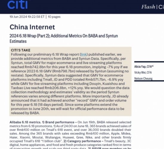 花旗引用數(shù)據(jù)指出,在天貓618活動(dòng)中,有365個(gè)品牌實(shí)現(xiàn)了超過1億元人民幣的銷售額,超過3萬6千個(gè)品牌實(shí)現(xiàn)了銷售額翻番,淘寶百億補(bǔ)貼GMV同比增長(zhǎng)550%。