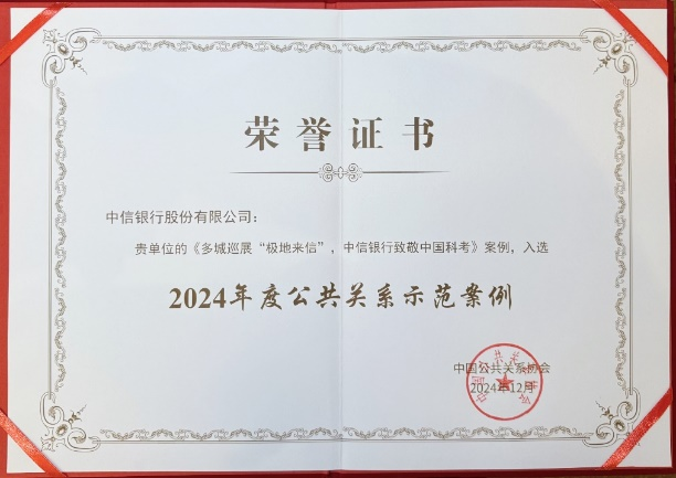 日前,2024年中國(guó)公共關(guān)系發(fā)展大會(huì)在北京舉辦,中信銀行“極地來(lái)信”整合品牌活動(dòng)通過(guò)多輪遴選,成功入選中國(guó)公共關(guān)系協(xié)會(huì)“2024年度公共關(guān)系示范案例”。