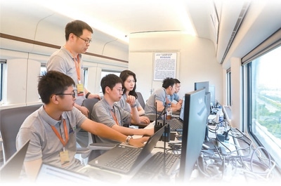 CR450青年團(tuán)隊(duì)成員在試驗(yàn)列車(chē)上研討技術(shù)細(xì)節(jié)。