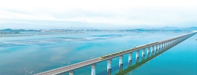 試驗(yàn)列車(chē)行駛在湄洲灣跨海大橋上。