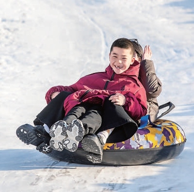 游客在甘肅張掖市甘州區(qū)冰雪世界絲路明珠歡樂谷滑雪圈。
