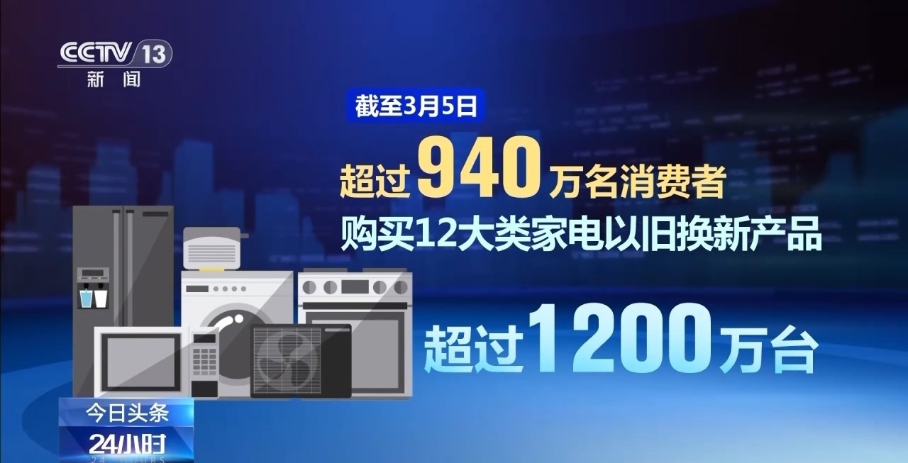 商務部數(shù)據顯示,截至3月5日,超過940萬名消費者購買12大類家電以舊換新產品超過1200萬臺,已有超過3400萬名消費者申請了超過4200萬件手機等數(shù)碼產品購新補貼。