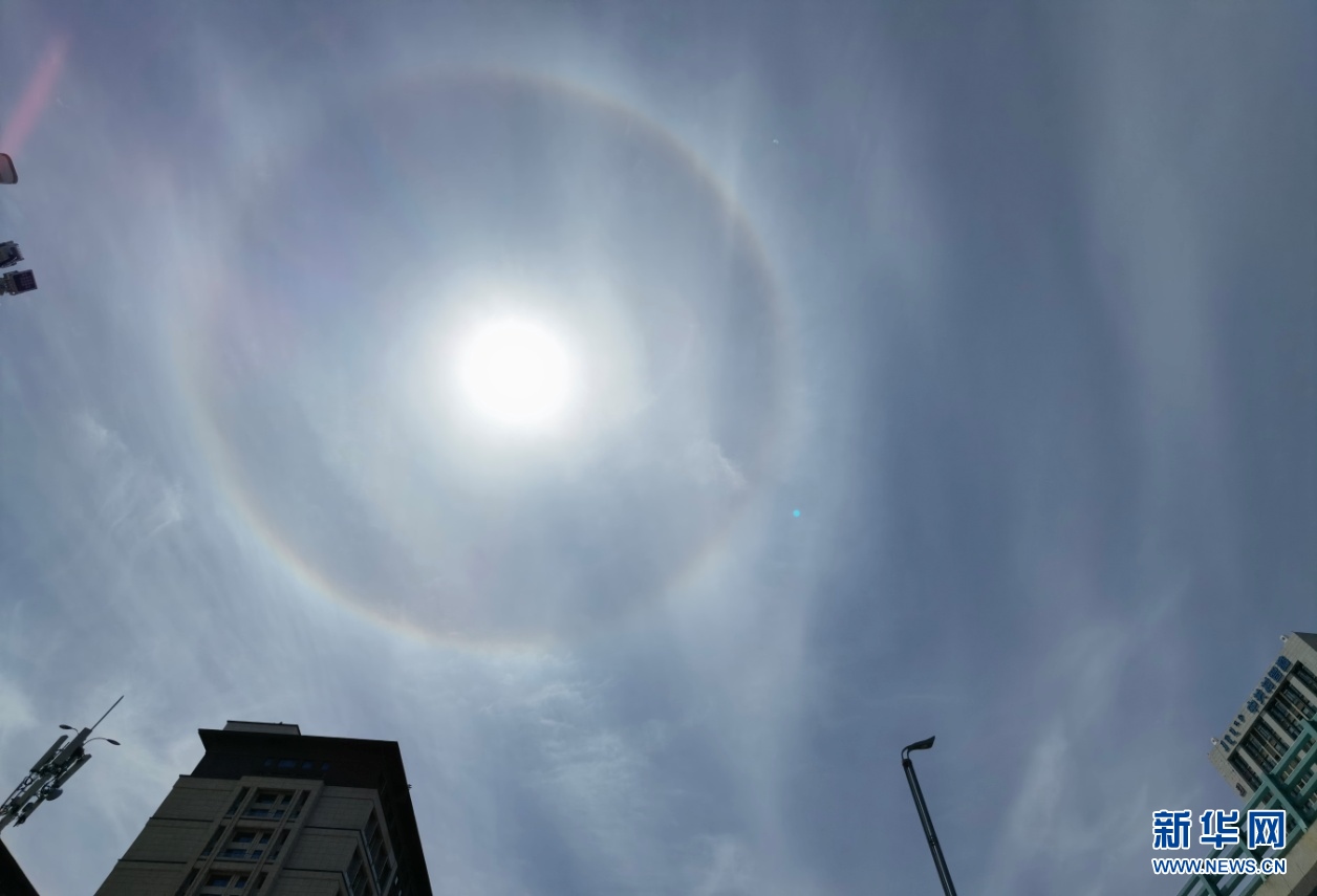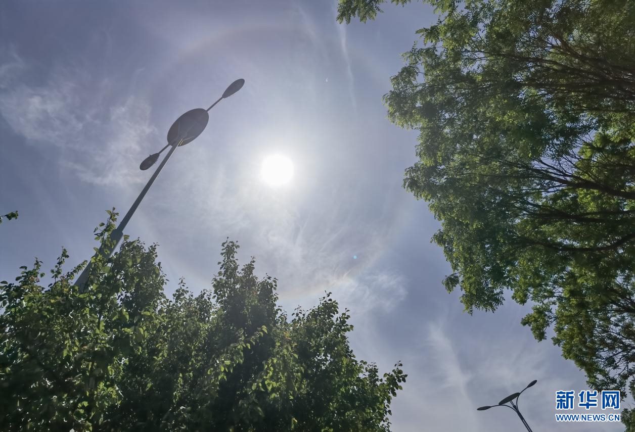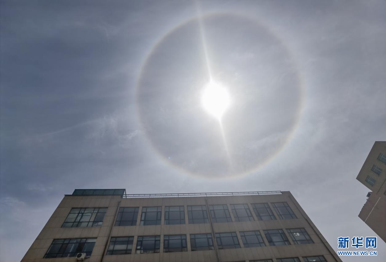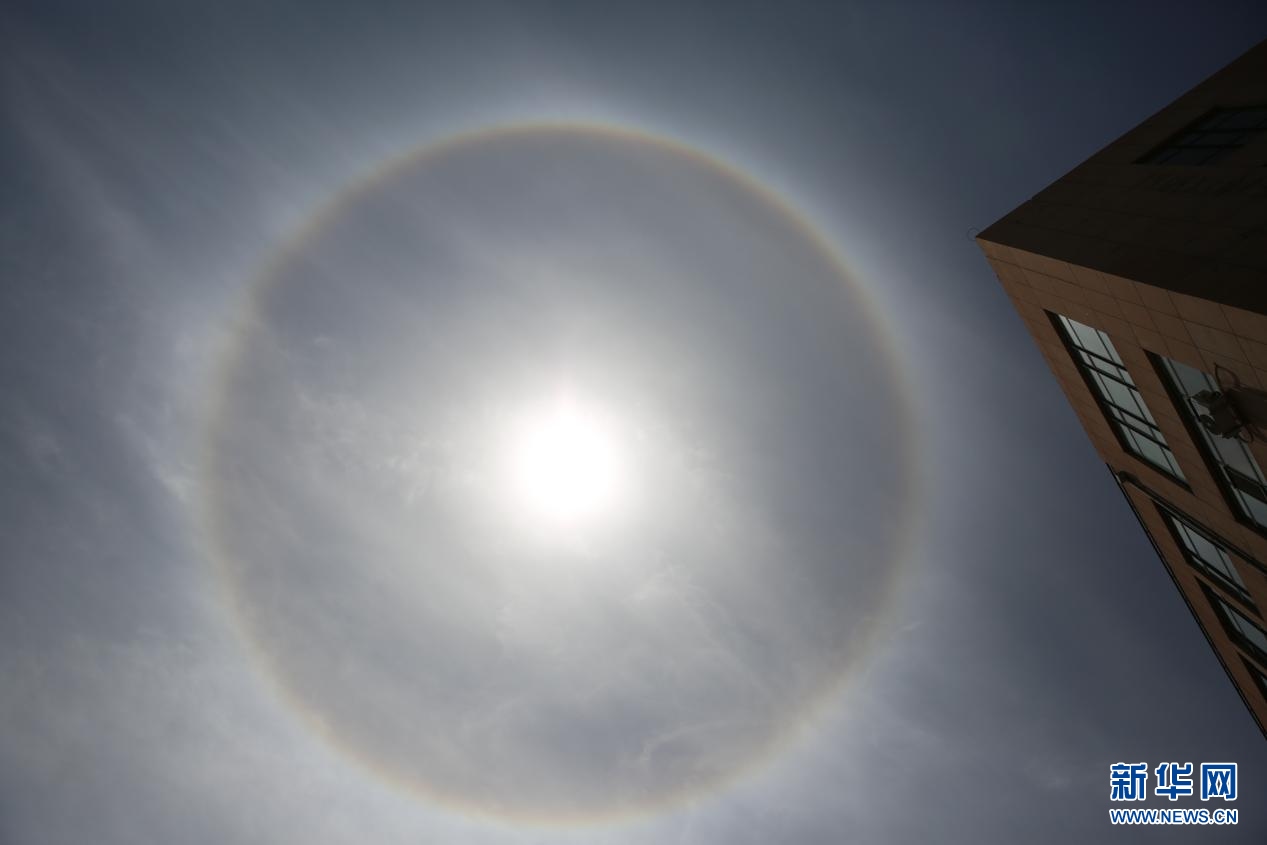 5月25日午后,內(nèi)蒙古自治區(qū)呼和浩特市上空出現(xiàn)日暈,巨大的暈環(huán)圍繞在太陽(yáng)四周,十分壯觀。新華網(wǎng) 楊騰格爾 攝