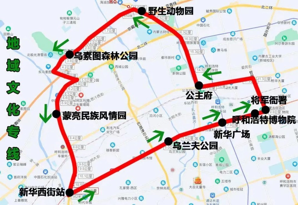 地域文化專線(新華西街站——蒙亮民族風情園),途經:新華西街、新華大街、哲里木路、海拉爾大街、通道北路、生態(tài)路、鹽站西街、北二環(huán)輔道、西二環(huán)輔道。沿途設站:新華西街,烏蘭夫公園、新華廣場、呼和浩特博物院、將軍衙署、公主府、野生動物園、烏素圖森林公園、蒙亮民族風情,全程:29公里,配車:10臺。