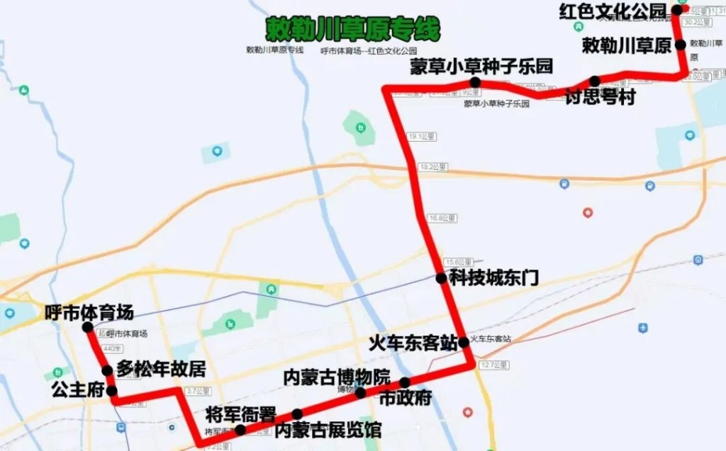 敕勒川草原專線(呼市體育場——紅色文化公園)途經:氣象局西巷、海拉爾西街、呼倫南路、新華大街、新華東街、科爾沁北路輔道、呼和塔拉西街、呼和塔拉東街、野馬圖、Y371。沿途設站:呼市體育場、多松年故居、公主府、將軍衙署、內蒙古展覽館、內蒙古博物院、市政府、火車東客站、科技城東門、蒙草小草種子樂園、討思號村、敕勒川草原、紅色文化公園,單程:30.5公里,配車:8—10臺。