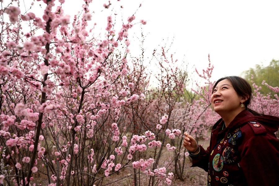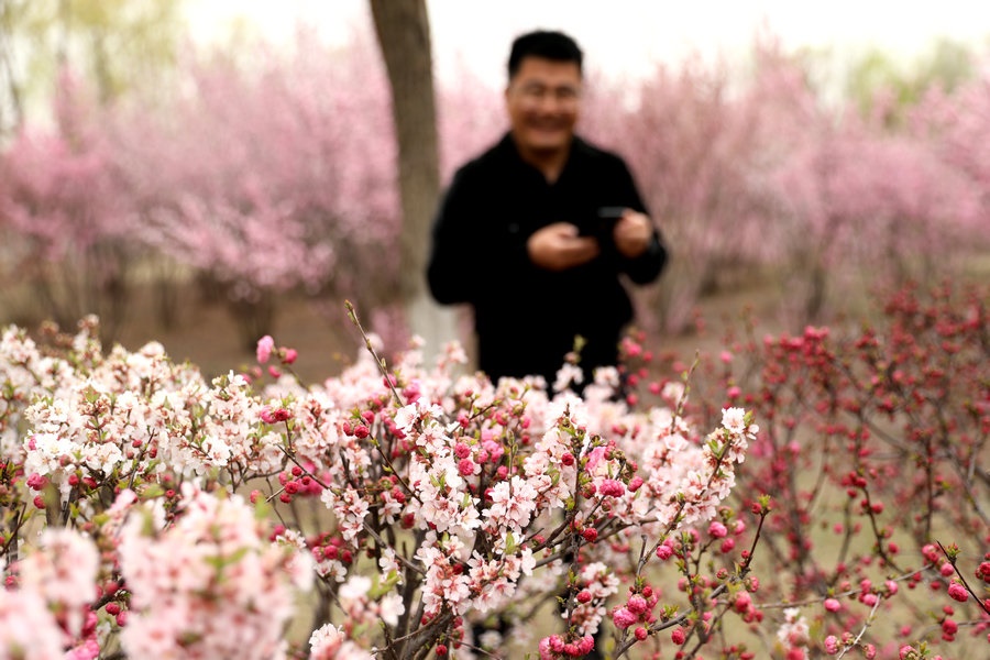 4月27日,呼和浩特南湖濕地公園的榆葉梅盛開,游客紛紛來此拍照打卡。