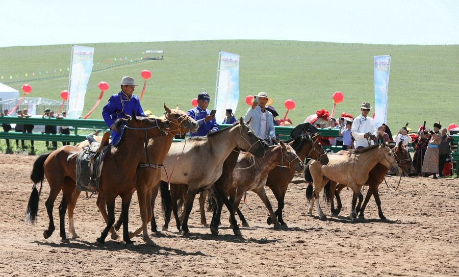 文藝演出結(jié)束后,進(jìn)行了傳統(tǒng)的那達(dá)慕賽事項目。賽馬場上群馬奔騰、塵土飛揚(yáng),場面蔚為壯觀,騎手們揚(yáng)鞭策馬,展現(xiàn)出精湛的騎術(shù),贏得觀眾陣陣歡呼。摔跤場上,搏克手你來我往互不相讓,斗智斗勇……