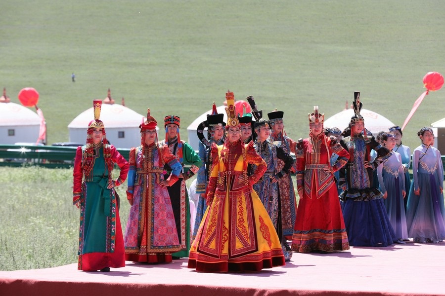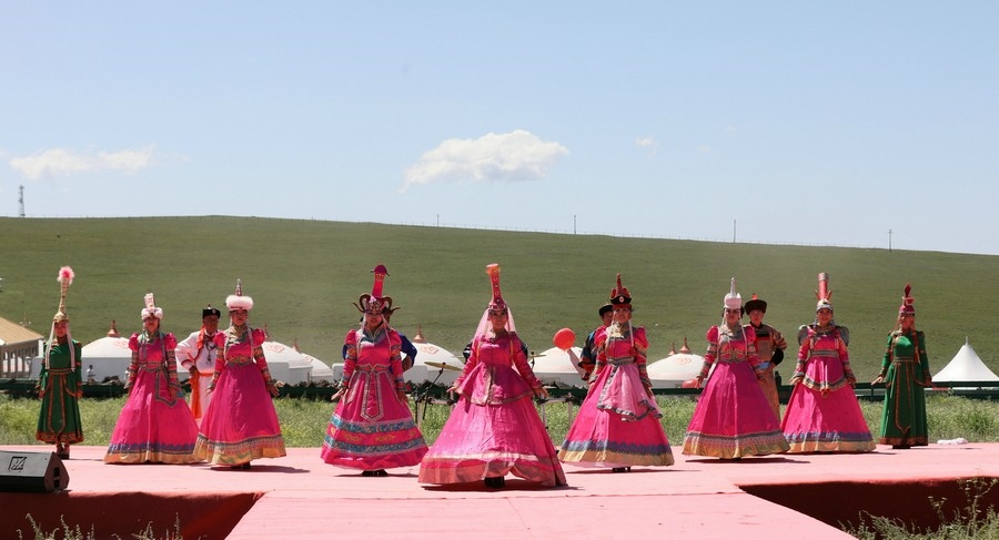 伴著悠揚(yáng)的歌聲,踏著激昂的步伐,在旗幟方隊的引領(lǐng)下,哈達(dá)方隊、民族方隊、烏蘭牧騎方隊、牧馬人方隊、裁判員及運(yùn)動員方隊依次走進(jìn)會場。隨著彩煙燃放,氣球升空,那達(dá)慕在梅林組合的歌曲《歡騰那達(dá)慕》中拉開帷幕。隨后,歌伴舞《石榴花開》等節(jié)目輪番登場,現(xiàn)場觀眾掌聲雷動,讓來自全國各地的游客在紅石崖高山牧場領(lǐng)略了草原的柔情。