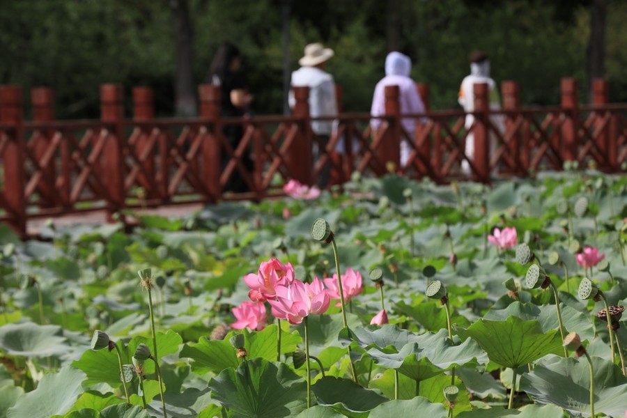 初秋時(shí)節(jié),水光瀲滟間,公園內(nèi)的滿池荷花嬌艷、荷葉青翠,漫步棧道中,仿佛置身于一幅詩(shī)意的畫卷。