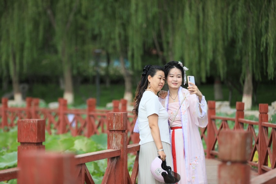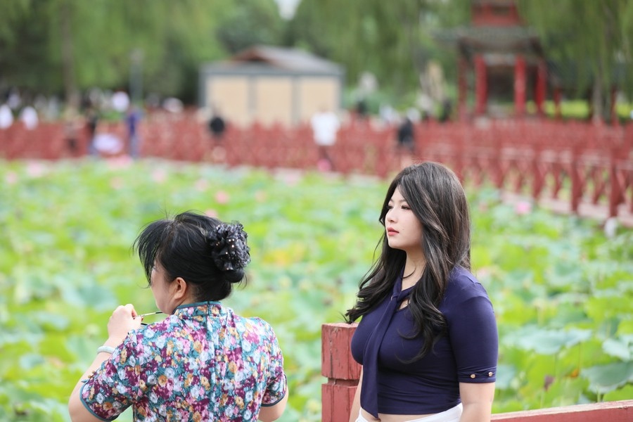 8月10日,內(nèi)蒙古烏海人民公園內(nèi)的荷花正盛放。游客在此賞荷拍照。
