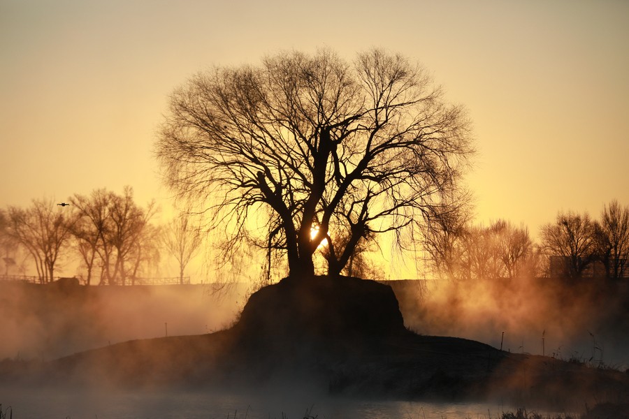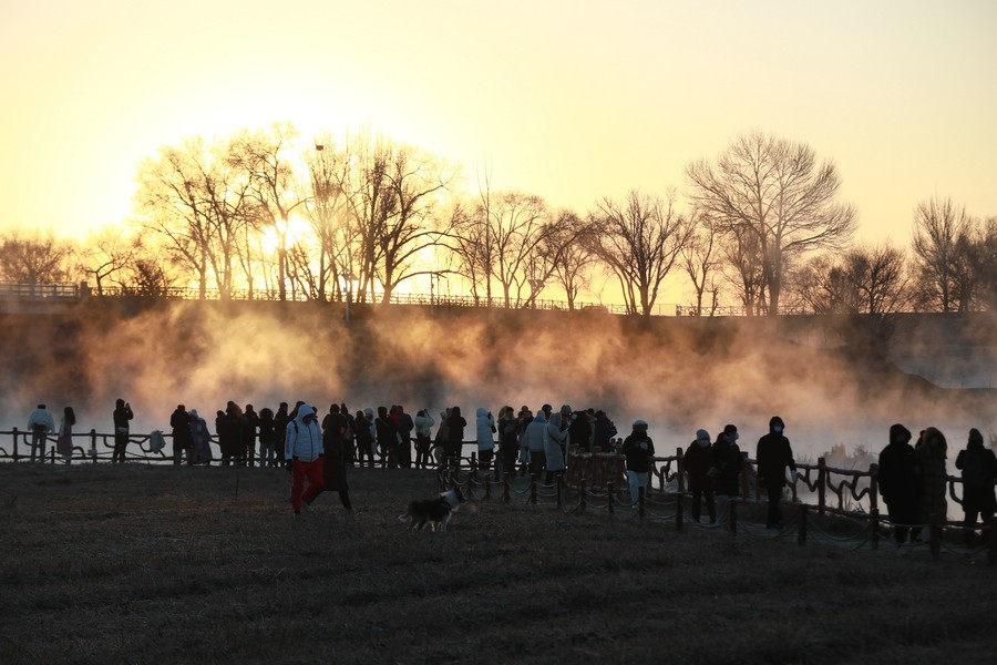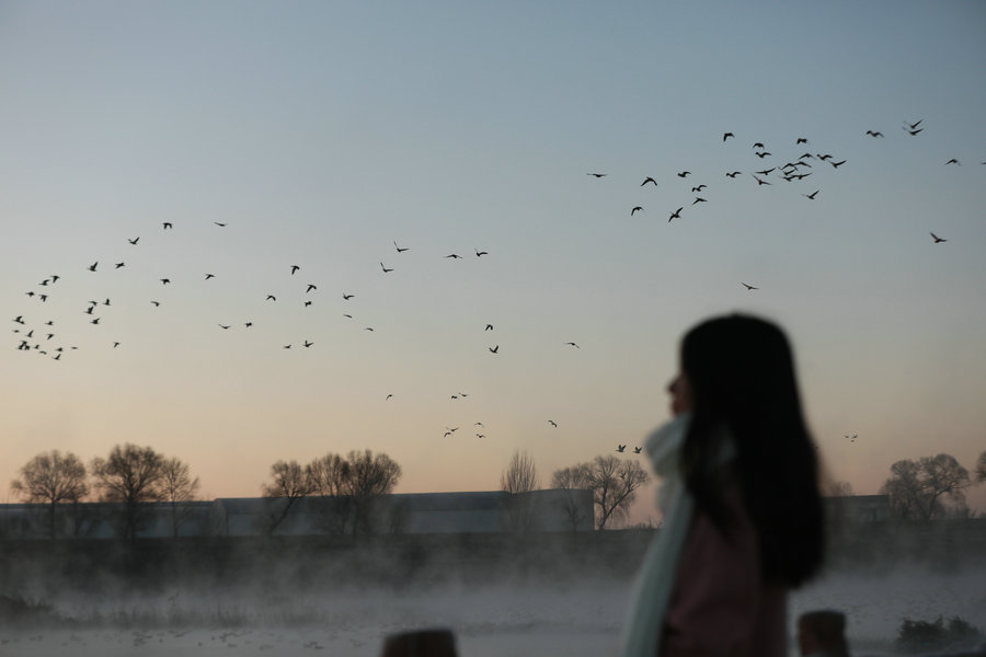12月15日清晨,上千名游人在呼和浩特玉泉區(qū)班定營村南側(cè)的塞外“千島湖”畔賞景打卡。此處湖水為城市污水經(jīng)處理達(dá)標(biāo)后的再生水,隆冬時節(jié),再生水流入湖中,水汽蒸騰,岸邊草木霧凇皚皚,良好的生態(tài)吸引了數(shù)萬只赤麻鴨在此翔集棲息,構(gòu)成一幅生動和諧的美麗畫面。每日清晨,都有上千名游客來此觀日出賞美景。