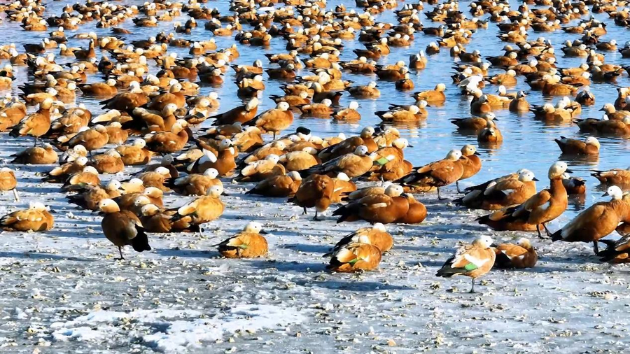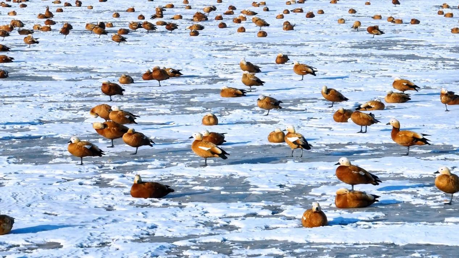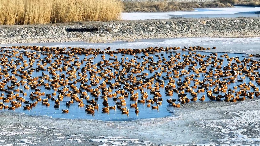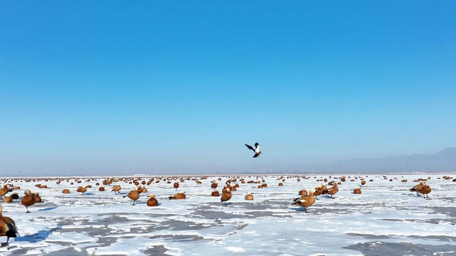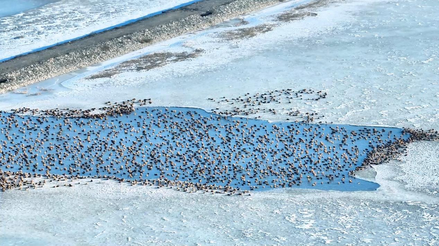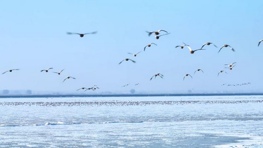 隨著天氣轉(zhuǎn)暖,冰雪消融,土默特左旗的海流水庫(kù)迎來(lái)了大批北歸的候鳥。它們或在水面上嬉戲覓食,或在空中自由翱翔,為初春封凍的水庫(kù)增添了一抹靈動(dòng)的色彩。