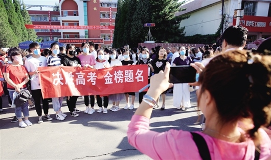 考場(chǎng)外,有幾位老師為學(xué)生拉起橫幅,喊起了口號(hào)。“決勝高考,金榜題名”顯眼的橫幅,響亮的口號(hào),讓考生們士氣滿滿。