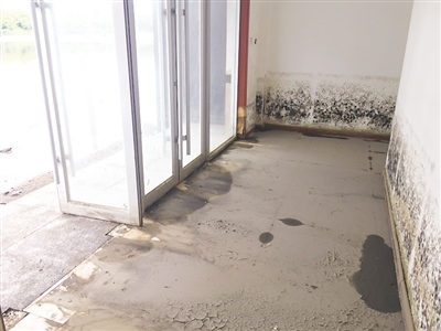 積水路面東側(cè)是已經(jīng)處于廢棄狀態(tài)的白廟子公安檢查站,檢查站內(nèi)外均殘留著被水泡過(guò)的痕跡。7月8日深夜,呼和浩特又降大雨。9日,記者再次來(lái)到緯五路看到,路面上的積水已經(jīng)蔓延到了檢查站樓內(nèi)。樓內(nèi)一片狼藉,從墻面上殘留的水印看,遭水淹最嚴(yán)重時(shí)樓內(nèi)積水深達(dá)五六十公分。