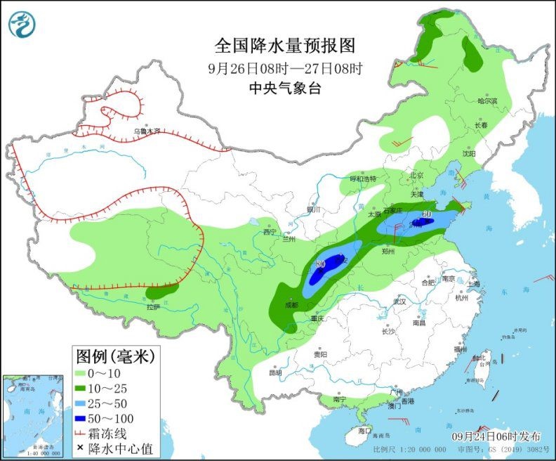 9月26日08時(shí)至27日08時(shí),內(nèi)蒙古東北部、西北地區(qū)東南部、華北南部、黃淮、四川盆地北部等地部分地區(qū)有中到大雨,其中,陜西中南部、山東中部、四川盆地北部等地部分地區(qū)有暴雨(50~80毫米)。內(nèi)蒙古東部、遼東半島等地部分地區(qū)有4~5級(jí)風(fēng)。