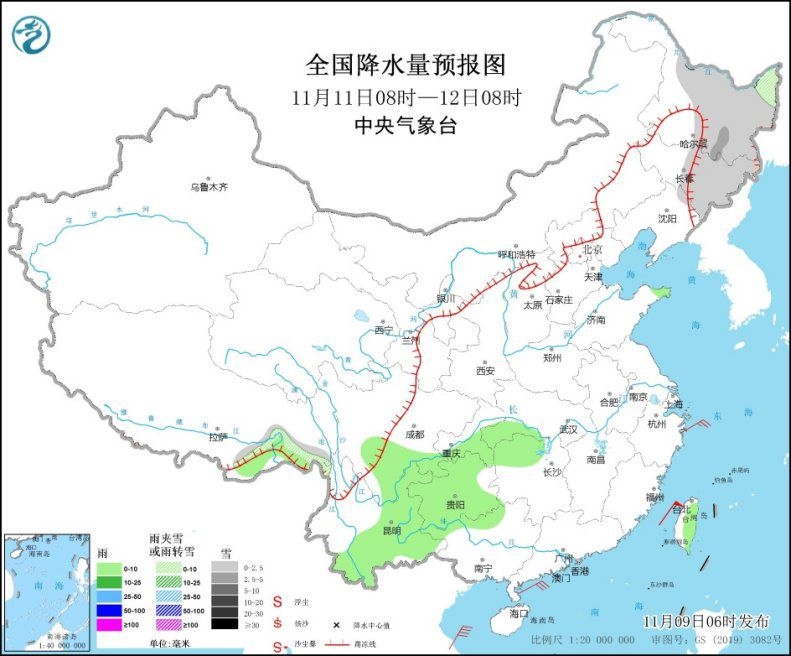 11月9日08時(shí)至10日08時(shí),內(nèi)蒙古東北部、東北地區(qū)大部等地部分地區(qū)有小到中雪,其中,黑龍江中西部、吉林中部、遼寧北部等地部分地區(qū)有大到暴雪(10~13毫米)。黑龍江東北部、川西高原北部、四川南部、貴州西南部、云南大部、臺灣島大部等地部分地區(qū)有小雨。內(nèi)蒙古河套地區(qū)和中部、東北地區(qū)西部、黃淮東部、江南東北部等地部分地區(qū)有4~6級風(fēng),其中,西藏北部部分地區(qū)有6~7級風(fēng)。