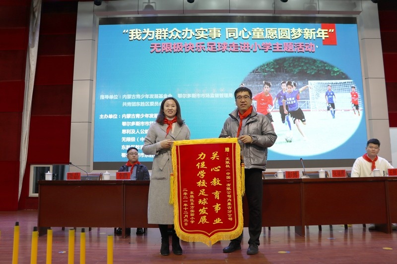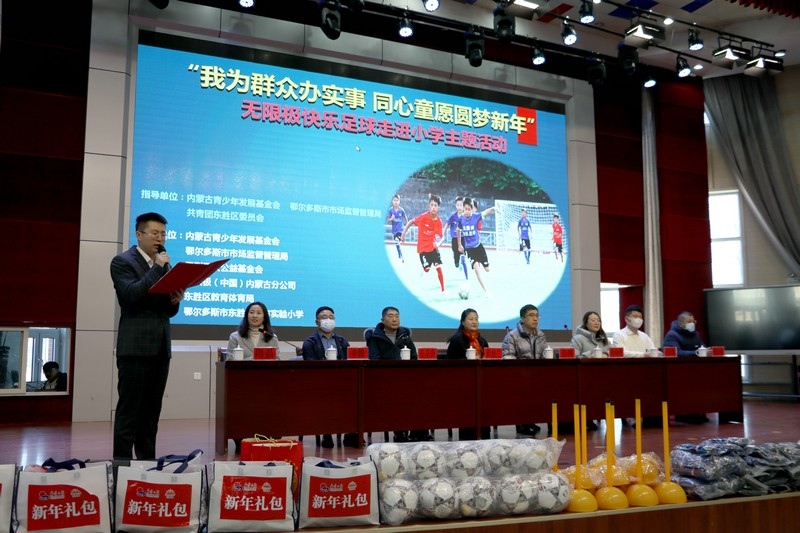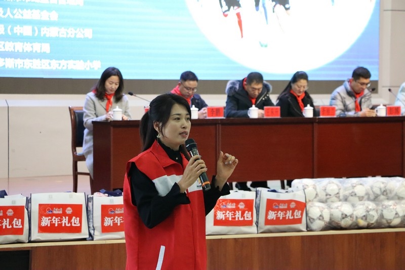 鄂爾多斯市市場監(jiān)督管理局副局長折桂蘭在公益活動上致辭,希望同學們不要單一地關注學習,而要德、智、體、美全面發(fā)展,提升綜合能力,同時用優(yōu)異的成績來回報每一個愛心人士的無私奉獻與幫助。也希望同學們分配好時間,能夠熱愛足球,熱愛自已感興趣的運動、愛好,這會讓生活更加多姿多彩,也希望同學們今后能多方面為國家貢獻自己的力量,成為各行業(yè)里的優(yōu)秀人才。