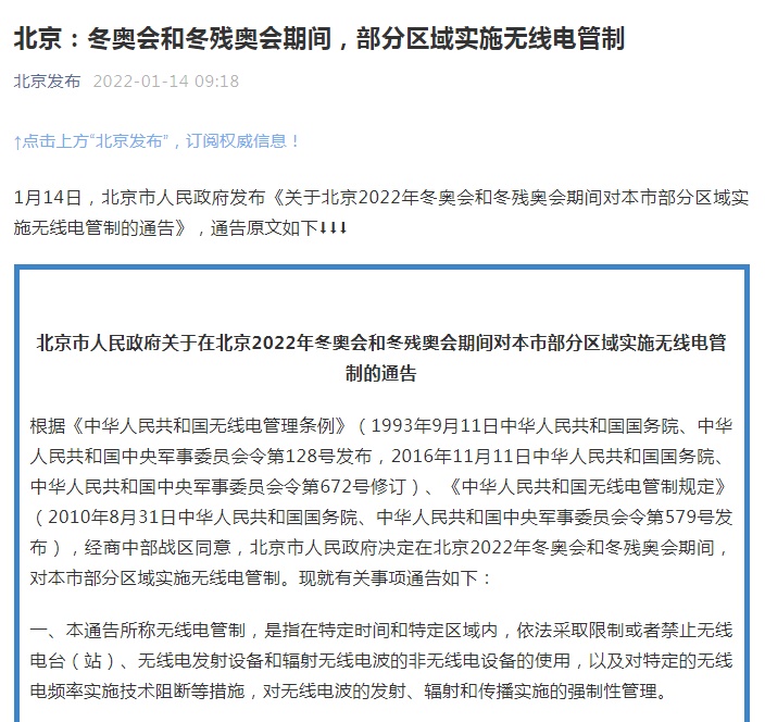 根據(jù)《中華人民共和國(guó)無(wú)線電管理?xiàng)l例》《中華人民共和國(guó)無(wú)線電管制規(guī)定》,經(jīng)商中部戰(zhàn)區(qū)同意,北京市人民政府決定在北京2022年冬奧會(huì)和冬殘奧會(huì)期間,對(duì)本市部分區(qū)域?qū)嵤o(wú)線電管制。具體有關(guān)事項(xiàng)通告如下: