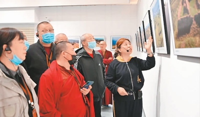 內(nèi)蒙古明長(zhǎng)城科普攝影展在內(nèi)蒙古展覽館開(kāi)展,高曉梅(右一)向觀眾做介紹。