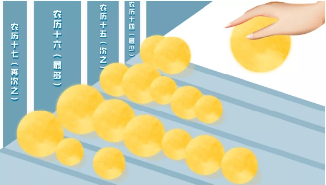 統(tǒng)計發(fā)現(xiàn),“滿月”出現(xiàn)次數(shù)最多的是農歷十六,其次是農歷十五,再次是農歷十七,最少的是農歷十四。