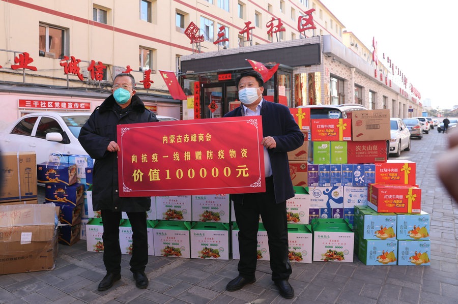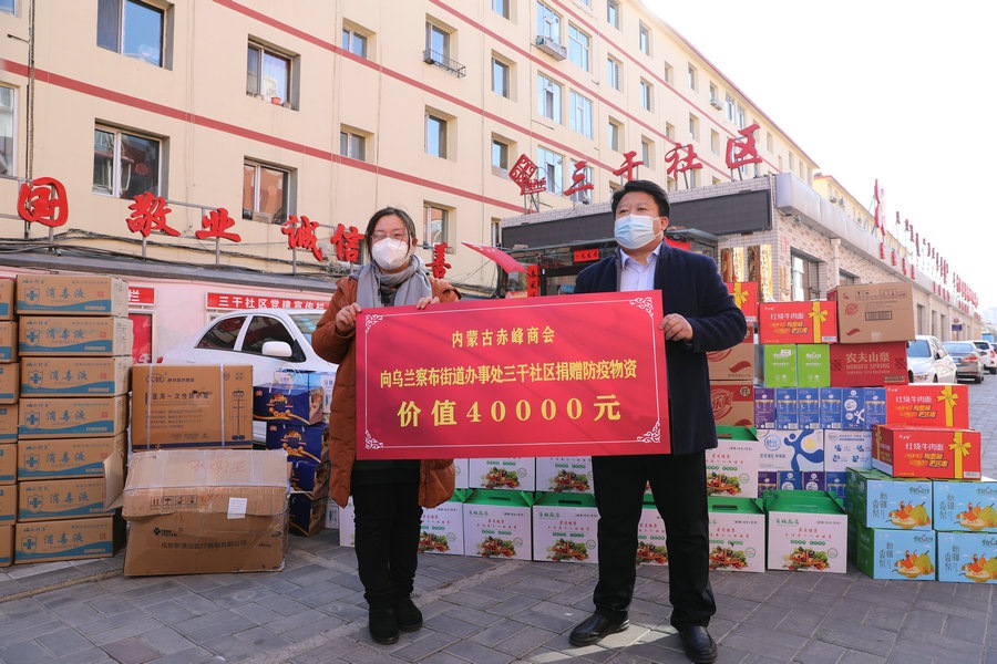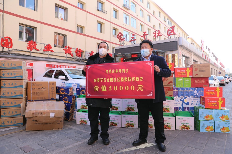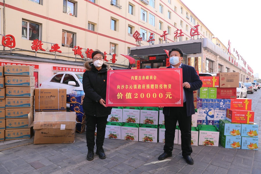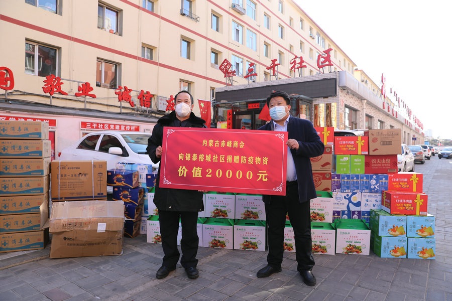 自疫情發(fā)生以來,內(nèi)蒙古赤峰商會慰問了呼和浩特市公安局賽罕區(qū)分局昭烏達路派出所,向抗疫一線公安民警表達慰問,并為他們送去第一批價值1萬元的抗疫物資;商會執(zhí)行會長張學(xué)春向新城區(qū)城市管理局捐贈5萬元防疫物資,用于一線疫情防控;商會副會長單位內(nèi)蒙古乾碩防水工程有限公司分別向呼和浩特市4個社區(qū)2個衛(wèi)生院捐贈了價值10萬元的防疫物資及生活必需品;商會聯(lián)合副秘書長單位蒙影影業(yè),走進玉泉區(qū)清泉街社區(qū),慰問抗疫一線工作人員,并為他們送去價值5000元的生活物資;商會聯(lián)合副會長單位友鵬實業(yè)集團,向回民區(qū)大慶路小學(xué)、伊利健康谷、東庫街社區(qū)、呼和浩特職業(yè)學(xué)院等防控一線捐贈價值10萬元的防疫物資。