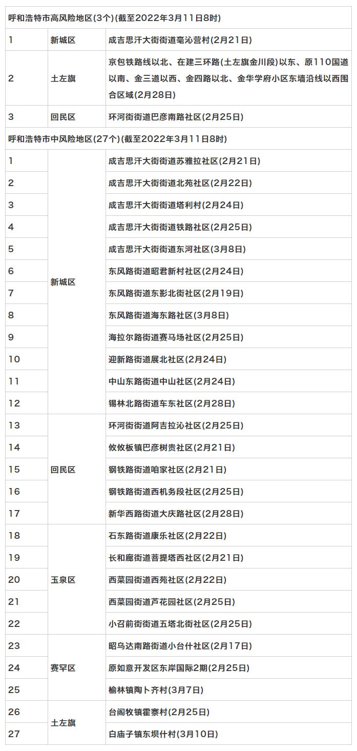 按照國務院聯(lián)防聯(lián)控機制《關于調整新冠肺炎疫情分區(qū)分級標準實施精準管控措施的通知》規(guī)定,經(jīng)專家組評估,市指揮部研究決定,決定于3月11日8時起,將新城區(qū)保和少鎮(zhèn)野馬圖村,回民區(qū)環(huán)河街街道太平街社區(qū),玉泉區(qū)長和廊街道大召社區(qū)、小召前街街道建華北街社區(qū)調整為低風險地區(qū)。其他地區(qū)風險等級不變。