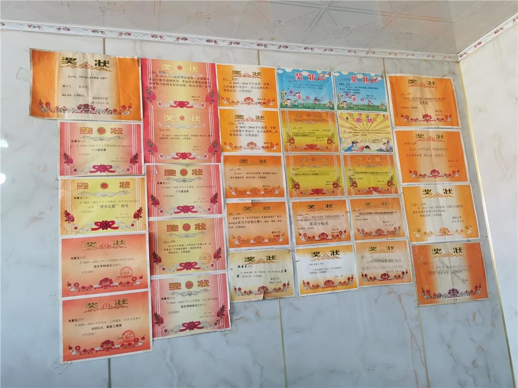 喜玉的家,陳設簡單,干凈利落。引人注目的是家里的一面墻壁,張貼著數(shù)十張獎狀。