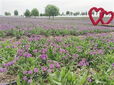 8月23日,記者來到馬鞭草花海,遠遠望去,遍野的紫色在視線中彌漫開來,叫人情不自禁奔向花海。微風拂過,花枝搖曳,心形造型、大風車、馬頭琴等景觀小品點綴其間,給花海增添了一份浪漫情調(diào)。人們沿著