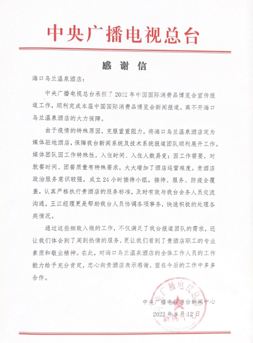 中央廣播電視總臺順利完成了在海南召開的2022年中國國際消費品博覽會的新聞報道,離不開海口烏蘭溫泉酒店的大力保障。媒體團隊因工作特殊性,入住時間、入住人數(shù)易變;對就餐時間、團餐質(zhì)量有特殊要求,大大增加了酒店運營難度。貴酒店政治服務(wù)意識較強,成立24小時接待小組,接待、服務(wù)、防疫全覆蓋,及時有效與我臺會務(wù)人員交流溝通,通過細致入微的工作,不僅滿足了我臺報道團隊的需求,還讓我們體會到了周到熱情的服務(wù),更讓我們看到了貴酒店職工的專業(yè)素質(zhì)和敬業(yè)精神。在此,對海口烏蘭溫泉酒店的全體工作人員的工作能力給予充分肯定,衷心向貴酒店表示感謝。