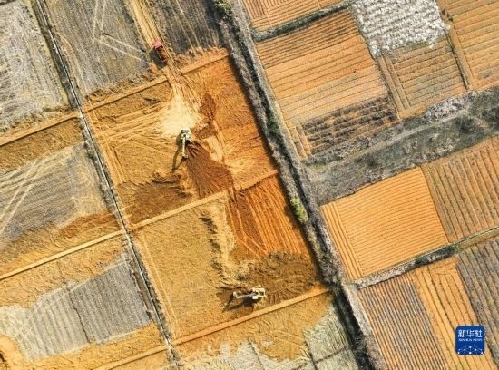 2月16日,在湖南省永州市道縣壽雁鎮(zhèn)芽洞村,工人駕駛挖掘機(jī)在高標(biāo)準(zhǔn)農(nóng)田建設(shè)項(xiàng)目現(xiàn)場(chǎng)施工(無人機(jī)照片)。