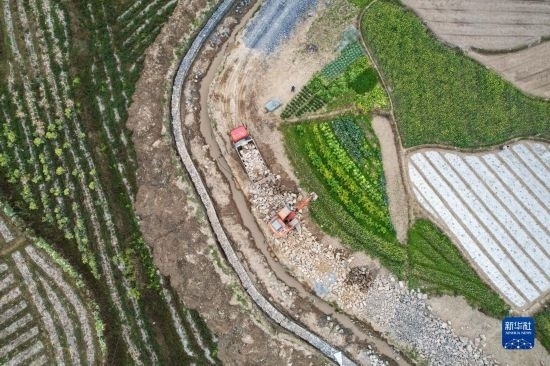 2月16日,在浙江省臺(tái)州市仙居縣雙廟鄉(xiāng),工人在水渠及機(jī)耕道路施工現(xiàn)場(chǎng)施工(無人機(jī)照片)。