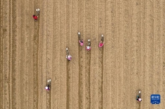 2月16日,村民在湖北省武漢市經(jīng)開區(qū)鄧南街田間進(jìn)行播種作業(yè)(無人機(jī)照片)。