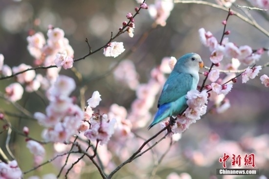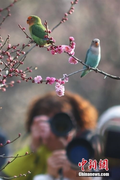 2月20日,江蘇南京,牡丹鸚鵡在梅花山梅花樹上“賞”梅。牡丹鸚鵡由南京一市民飼養(yǎng),每年在梅花盛開的時(shí)候,他都會(huì)帶著鸚鵡來到這里“賞”梅,同時(shí)也成為一景。中新社記者 泱波 攝