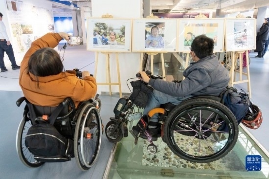 2月22日,肢殘人士乘著輪椅參觀“融合無(wú)障愛、攜手向未來(lái)”殘障融合主題兒童青少年攝影作品巡展。