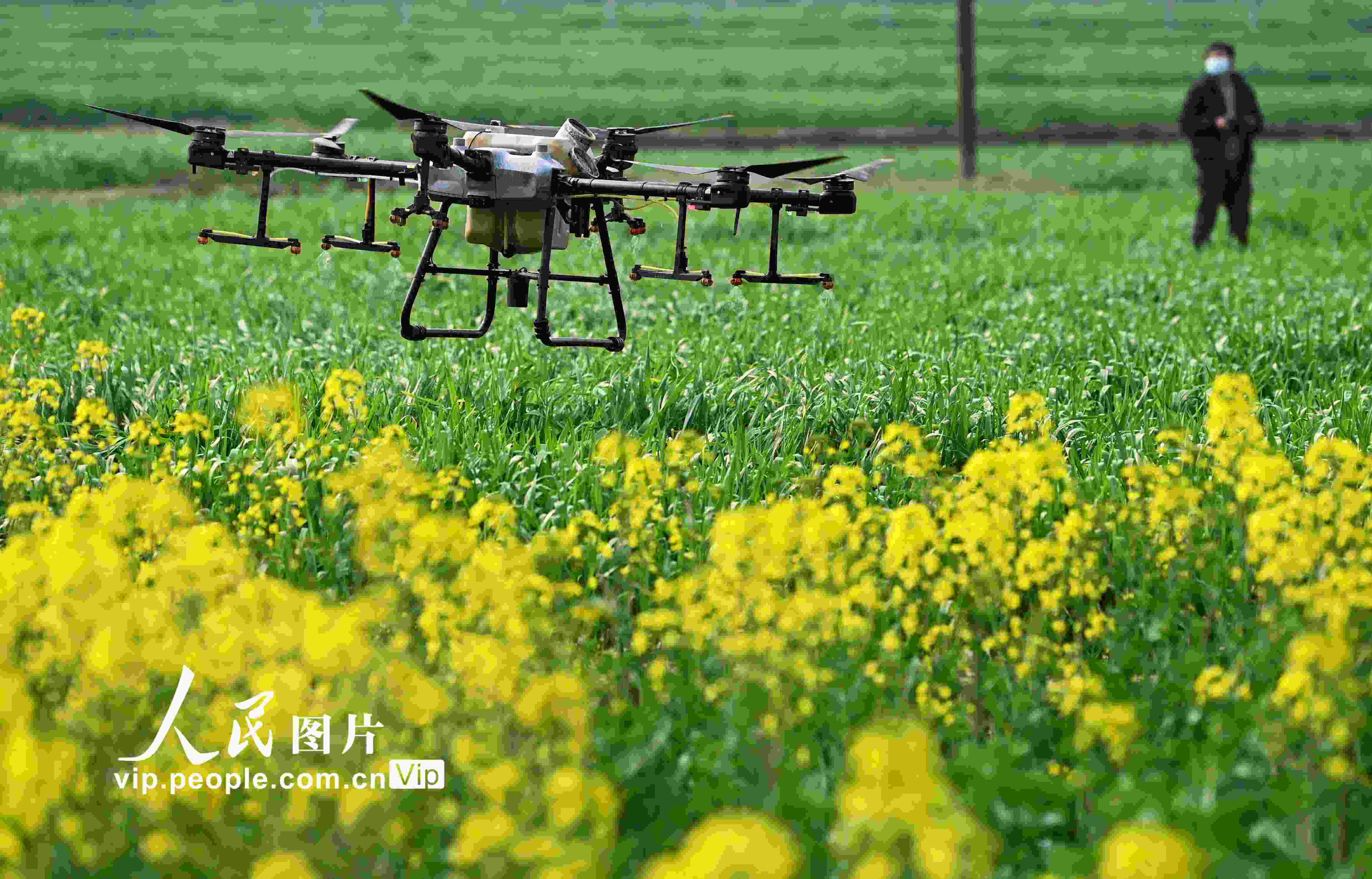 2023年2月25日,四川省南充市蓬安縣睦壩鎮(zhèn)武勝村,工作人員操控植保無人機在麥田噴灑農藥。劉永紅攝(人民圖片網)