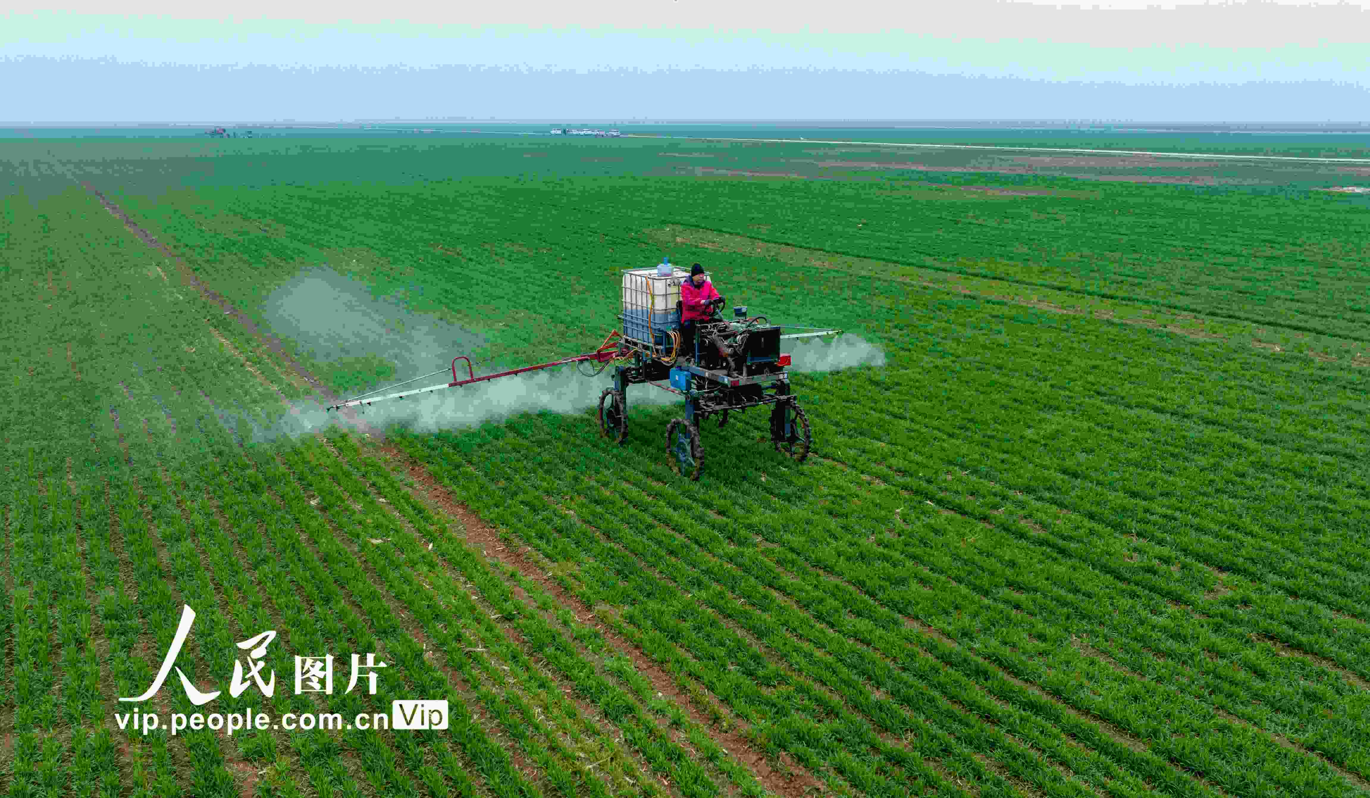 2023年2月25日,河南省駐馬店市西平縣老王坡高標準農田,農民正在駕駛農機設備噴灑農藥。趙永濤攝(人民圖片網)