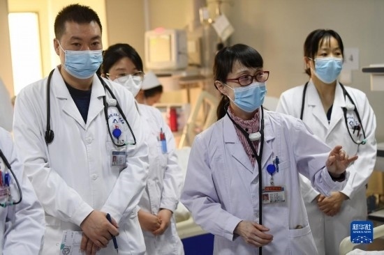 3月6日,馬娜(右二)和同事在病房內(nèi)查房。