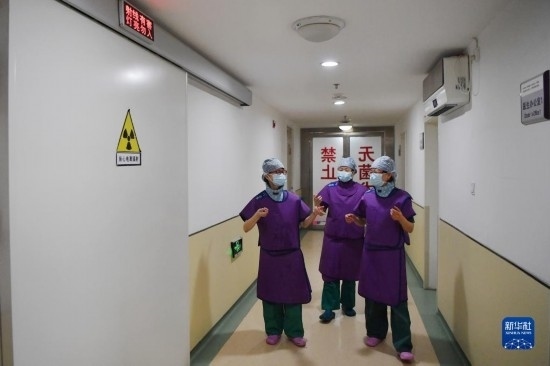 3月6日,穿上鉛衣的馬娜(左一)和同事準備進入手術(shù)室。