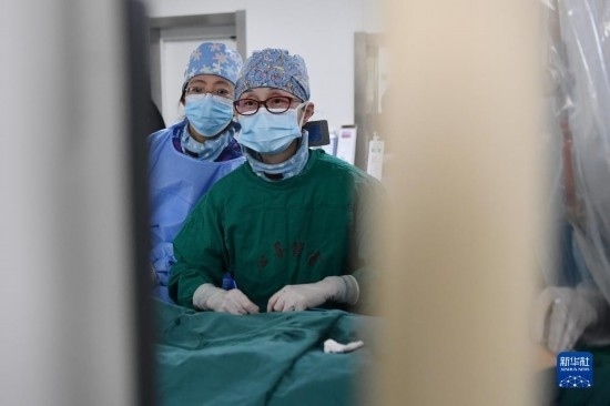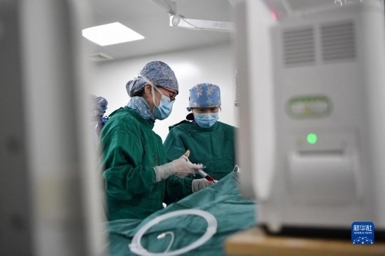 3月7日,馬娜(右)和同事在手術(shù)室為患者進行介入手術(shù)治療。