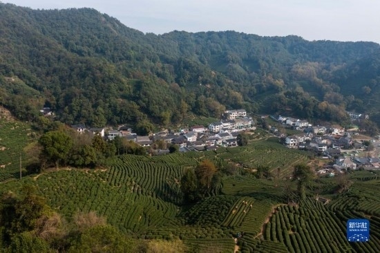 3月13日,空中俯瞰梅家塢村的西湖龍井茶地(無人機照片)。