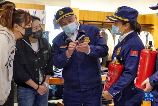 3月14日,消防支隊(duì)防火監(jiān)督員(中)為商場(chǎng)商戶(hù)講解如何使用手機(jī)掃碼方式辨別消防產(chǎn)品真?zhèn)巍?/p>
