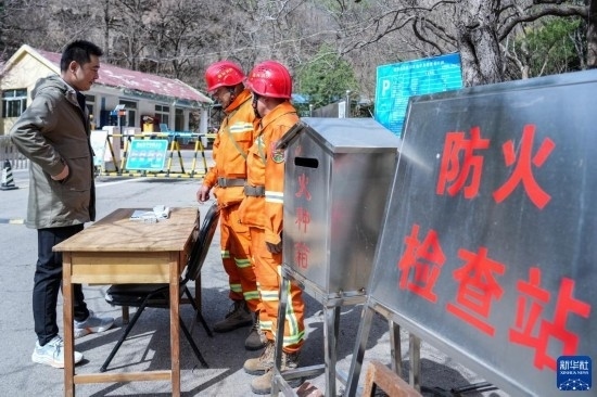 3月15日,長清區(qū)國有蓮臺山林場防火中隊隊員在林區(qū)入口檢查火源。