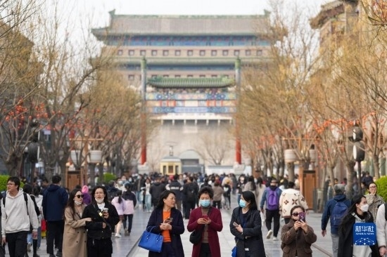 3月19日,游客在北京前門大街商圈游玩。