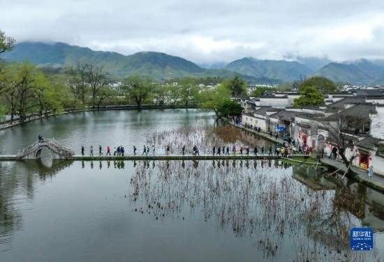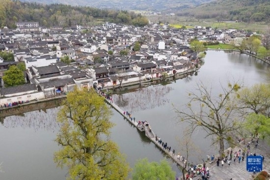 3月24日,游客在黟縣宏村南湖游覽(無人機(jī)照片)。