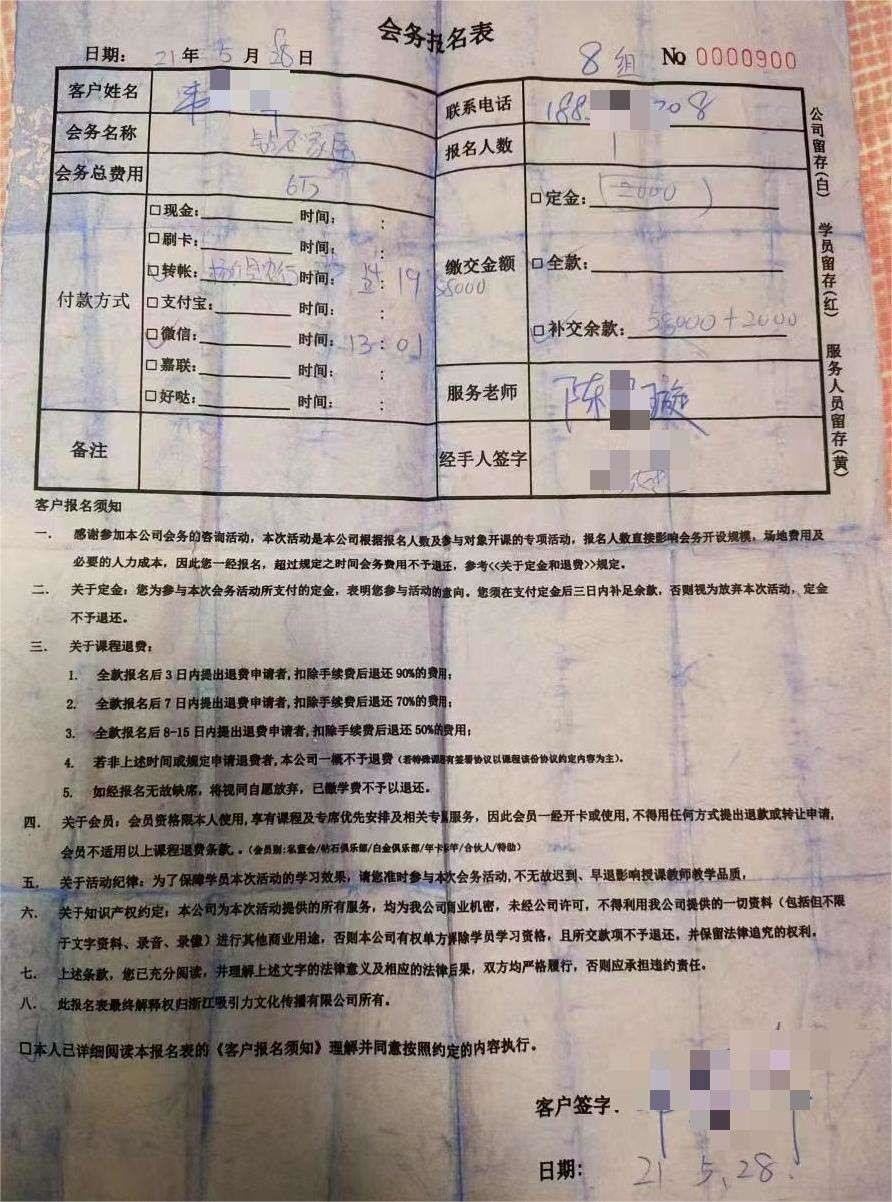 “我愿意?!边@名女學(xué)員回答后,便接過(guò)楊濤鳴給的一張“會(huì)務(wù)報(bào)名表”的單據(jù)。