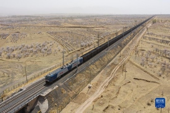 重載列車行駛在大秦鐵路上(4月11日攝,無人機(jī)照片)。